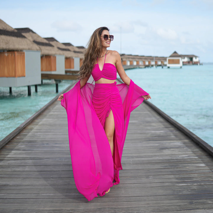Elevate your vacation style with our stunning 3-piece halter neck co-ord set in vibrant hot pink. Flaunt a sassy top and skirt combo, featuring a daring high slit for a touch of glam. Complete the look with a trendy shrug that adds an extra layer of chic. Embrace the ultimate vacay vibes and turn heads!