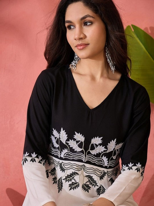 White & black floral embroidered tunic has V neck three quarter sleeve
