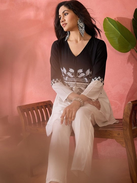 BLACK FLORAL EMBROIDERED V-NECK TUNIC WITH TROUSER