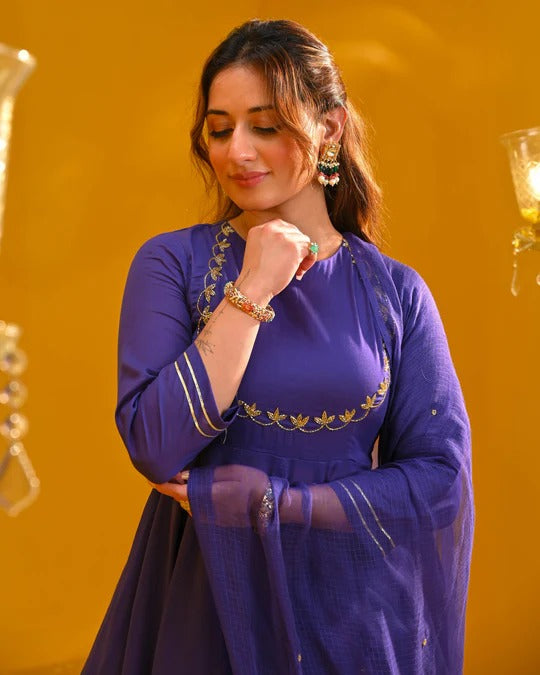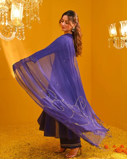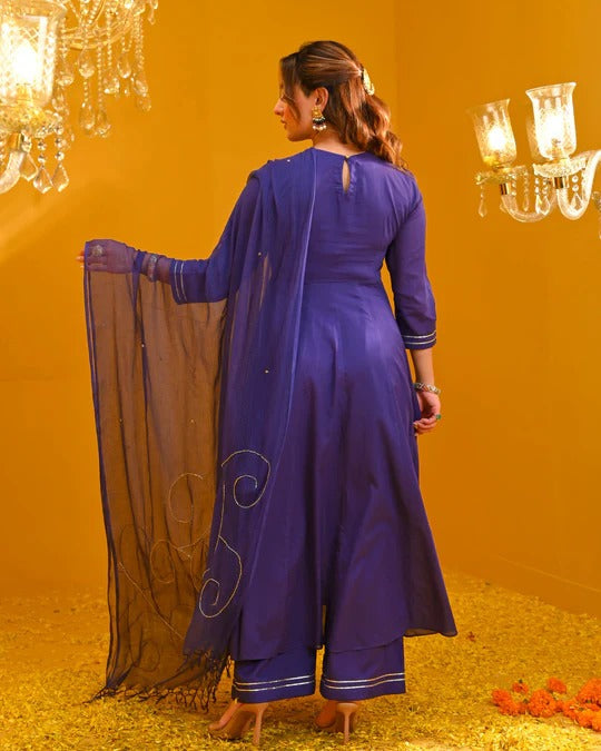 Damini Cotton Suit Set shines in a sophisticated navy hue, crafted from plush cotton for exceptional comfort. The flared Anarkali-style kurta features a round neck with an intricately embellished yoke, adding a touch of elegance. Paired with matching pants, the look is beautifully completed with an embellished Kota Doriya dupatta, making it an ideal choice for festive events and celebrations.
