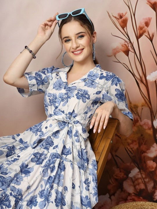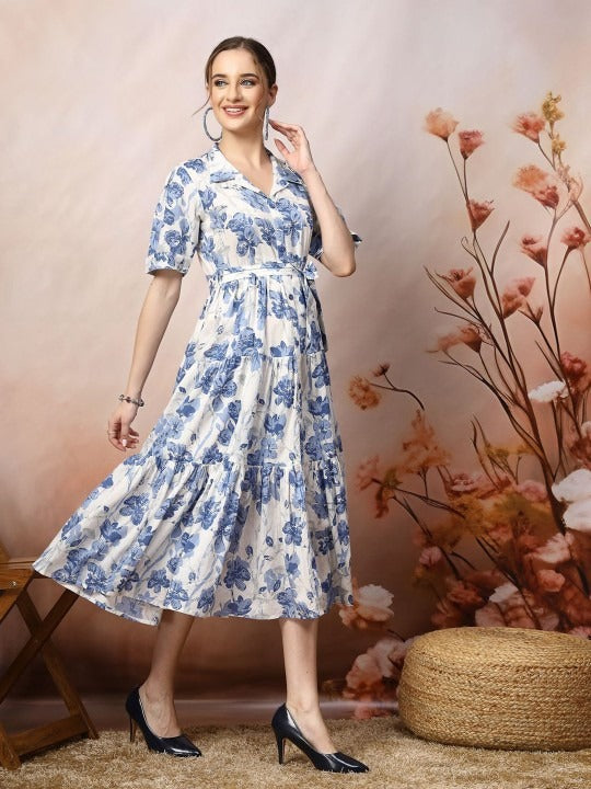 BLUE FLORAL PRINTED FIT & FLARE DRESS