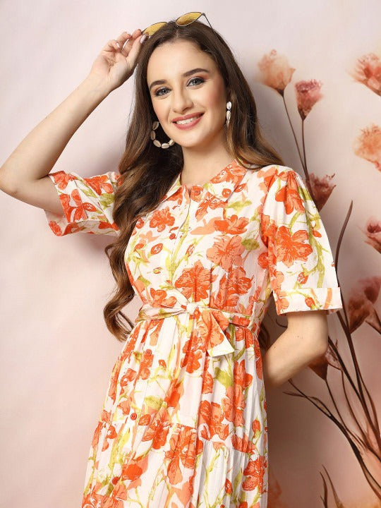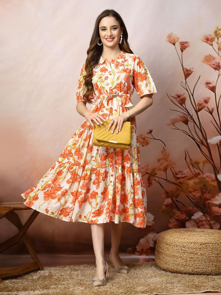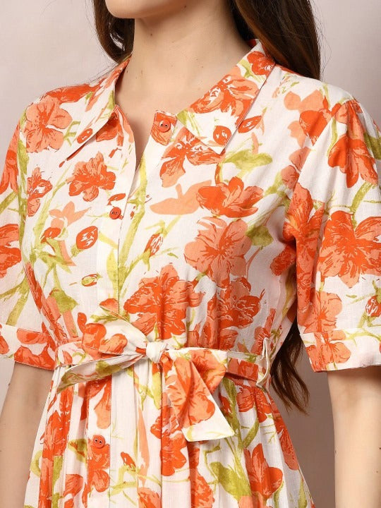 - Orange floral print fit & flare dress