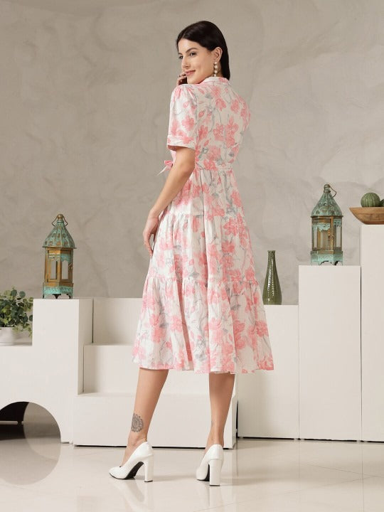 WOMEN FLORAL PRINTED LAYERED GEORGETTE FIT & FLARE MIDI DRESS