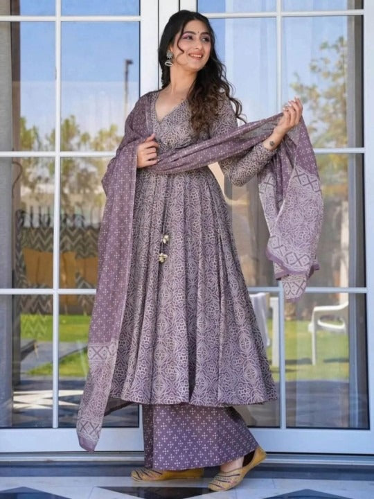 Puple, grey and white printed Kurta with Palazzos and dupatta