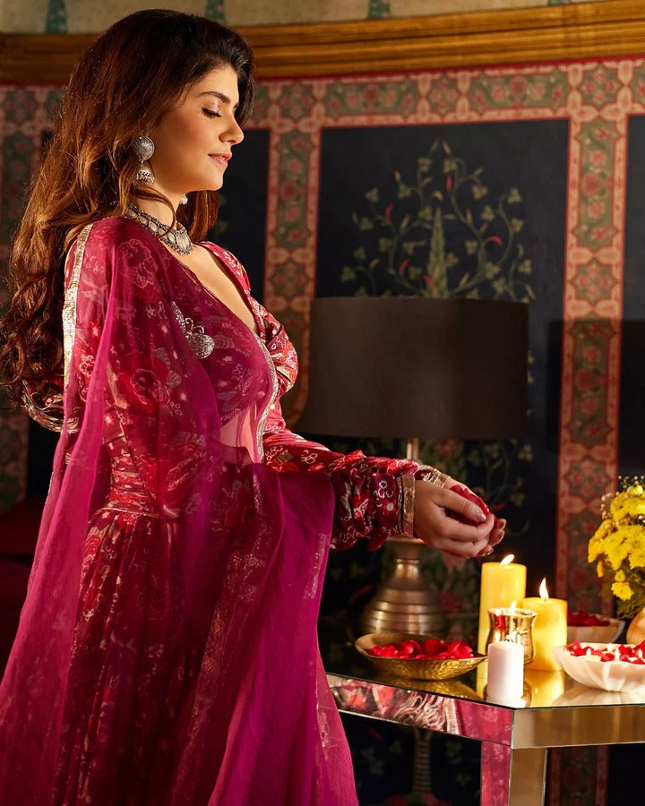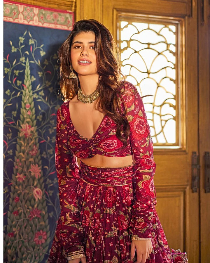Sanjana Sanghi in Inina Chanderi Lehenga Set by Omyoka. Sanjana is a sight of elegance and bespoke beauty in this masterpiece that beautifully intertwines traditional block prints with ultra modern silhouette set in a unique shade of deep red. A perfect pick for festivities and all those special moments, this is surely a headturner. Oh and you got to #TwirlLikeSanjana to experience the breeziness of the Chanderi fabric and its beautiful flare!