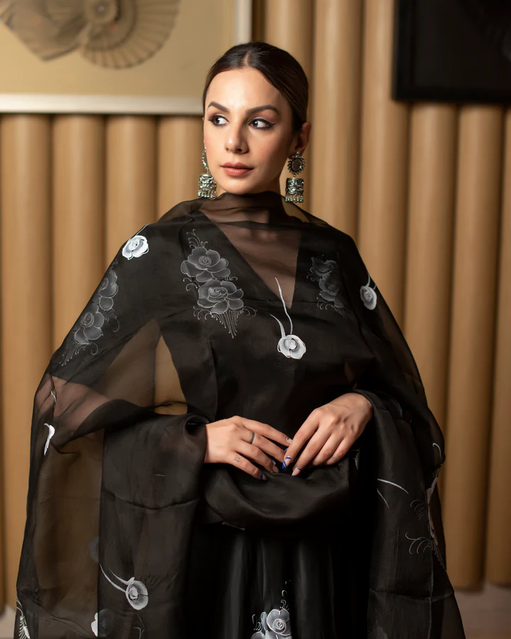 YELLOW ORGANZA HANDPAINTED SUIT SET