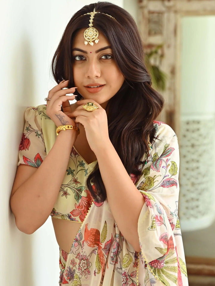 Elevate your style with our enchanting Light Green Printed Ruffle Saree. Delicately adorned with intricate prints and playful ruffles, this saree effortlessly blends elegance with a touch of whimsy. Perfect for those who embrace both tradition and contemporary flair, it's a captivating choice for any occasion.