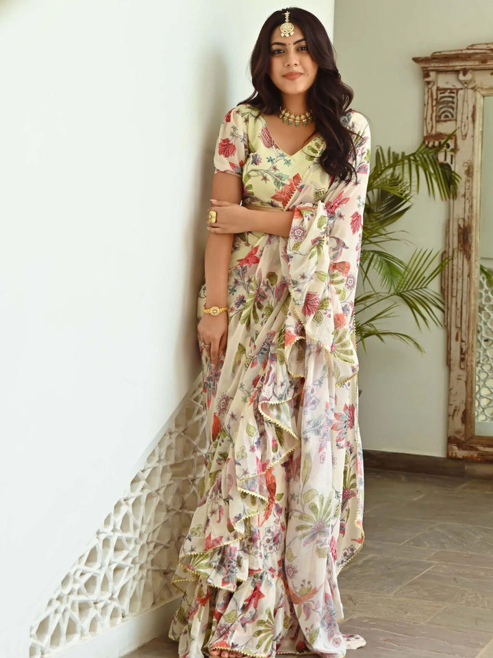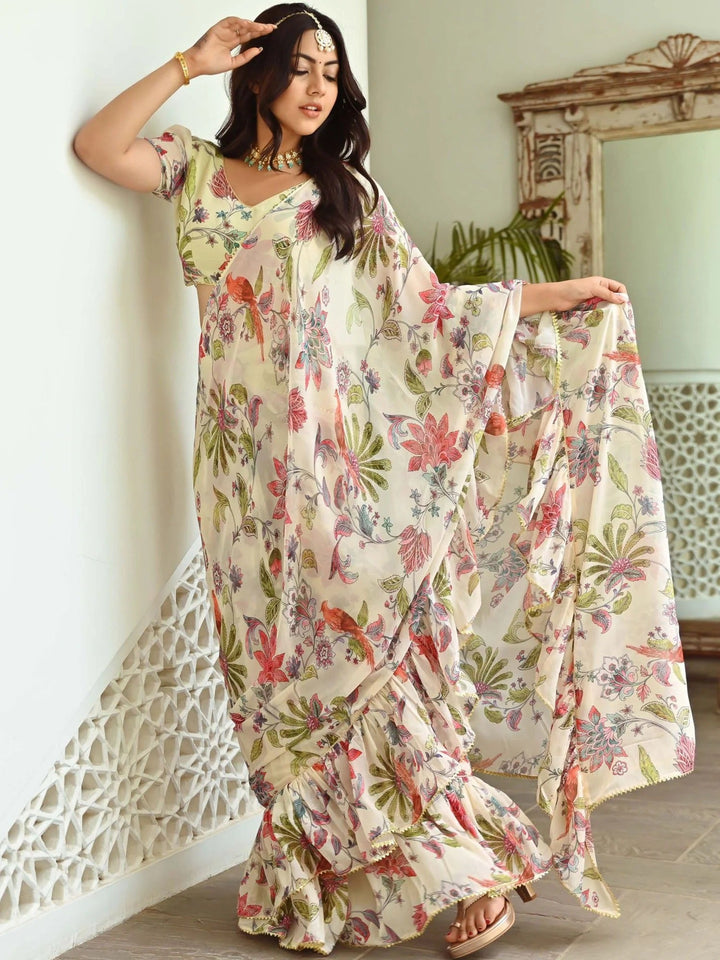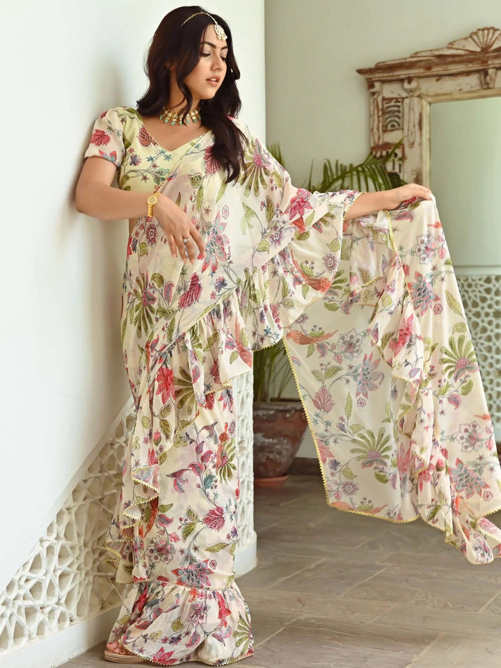 LIGHT GREEN PRINTED RUFFLE SAREE