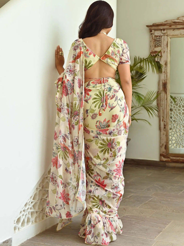 YELLOW PRINTED RUFFLE SAREE