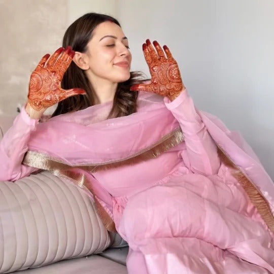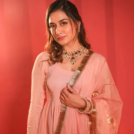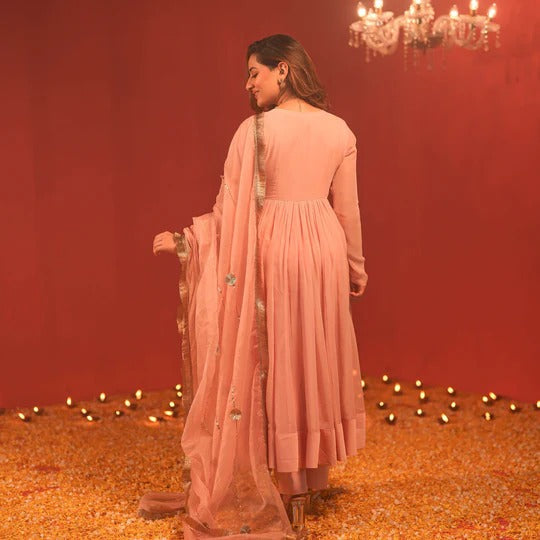 Elevate your elegance with our Misty Pink Georgette Suit Set, exuding timeless charm. This exquisite ensemble showcases a graceful Anarkali silhouette, adorned with full sleeves for a regal touch. The ethereal organza dupatta, finished with a delicate fringe border, adds a touch of sophistication to this enchanting outfit.