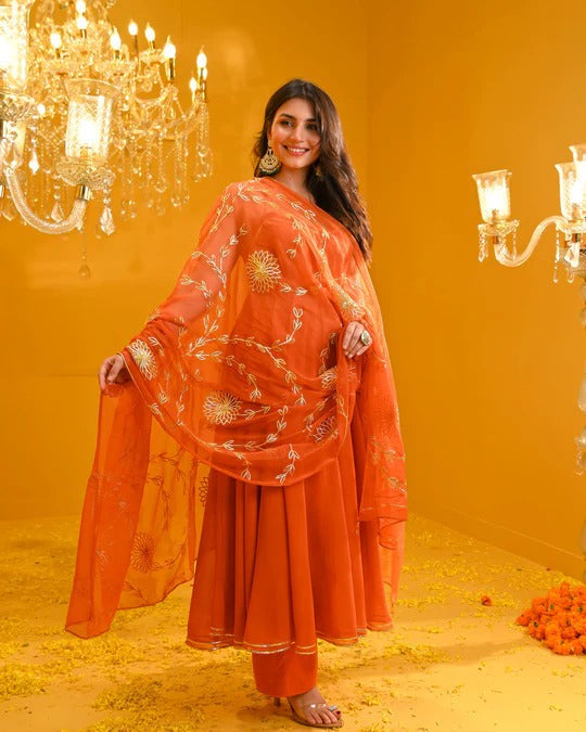 The Nandini Georgette Suit Set dazzles in a vibrant orange hue, made from plush georgette fabric. Featuring a flared Anarkali-style kurta with a unique sweetheart halter neck, this ensemble exudes modern elegance. Paired with matching pants and a heavily gota-embroidered dupatta, it's a statement piece perfect for adding flair to any festive or special occasion.