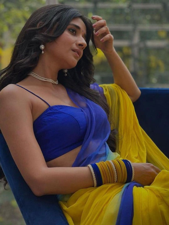 The blouse worn by the model might be for modelling purpose only. Check the image of the blouse piece to understand how the actual blouse piece looks like.