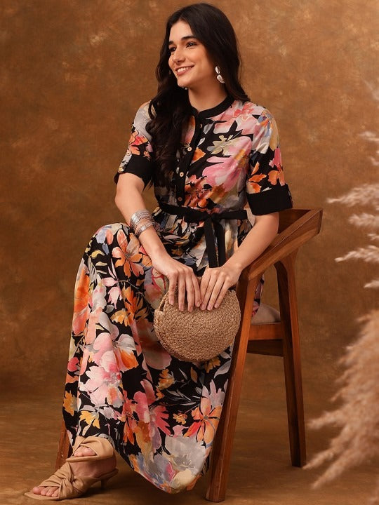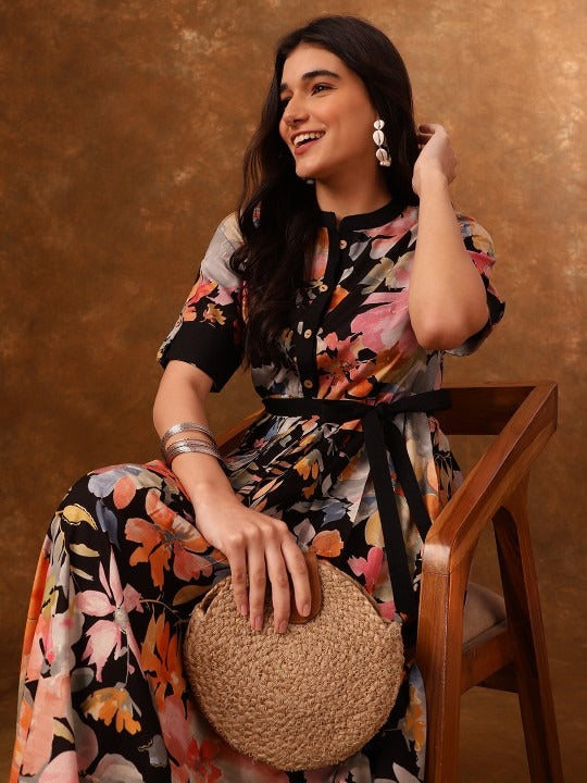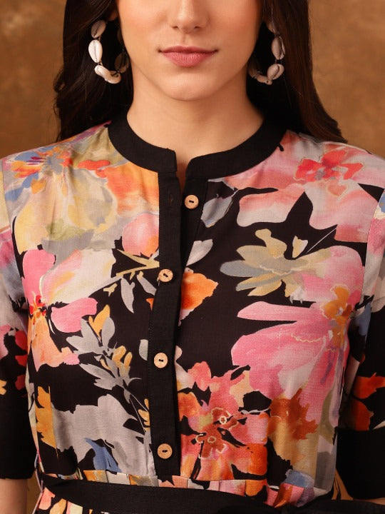 Black & pink printed fit & flare dress