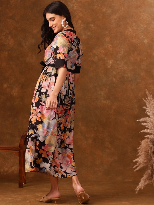 WOMEN FLORAL PRINTED LAYERED GEORGETTE FIT & FLARE MIDI DRESS