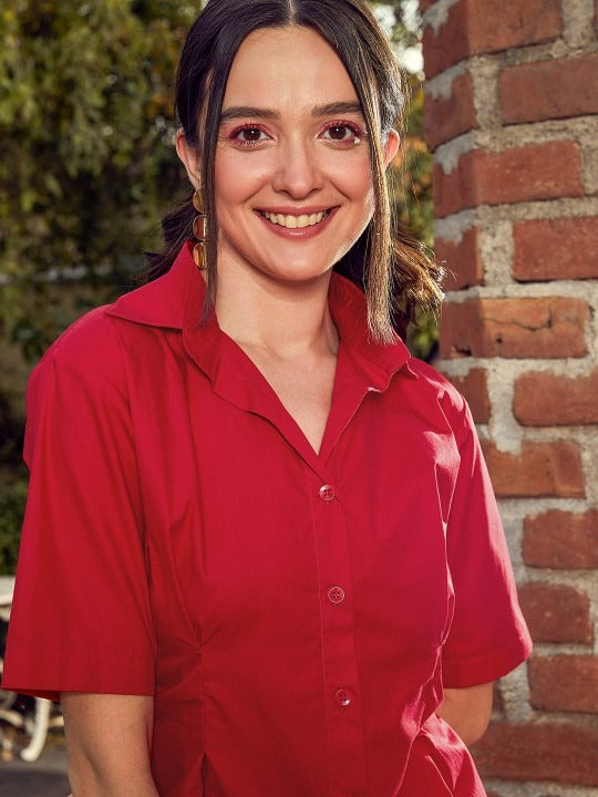 RED SMOCKED PURE COTTON SHIRT MINI DRESS
