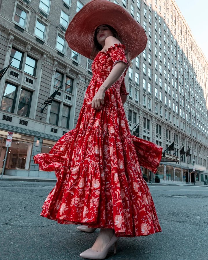 RED SMOCKED PURE COTTON SHIRT MINI DRESS
