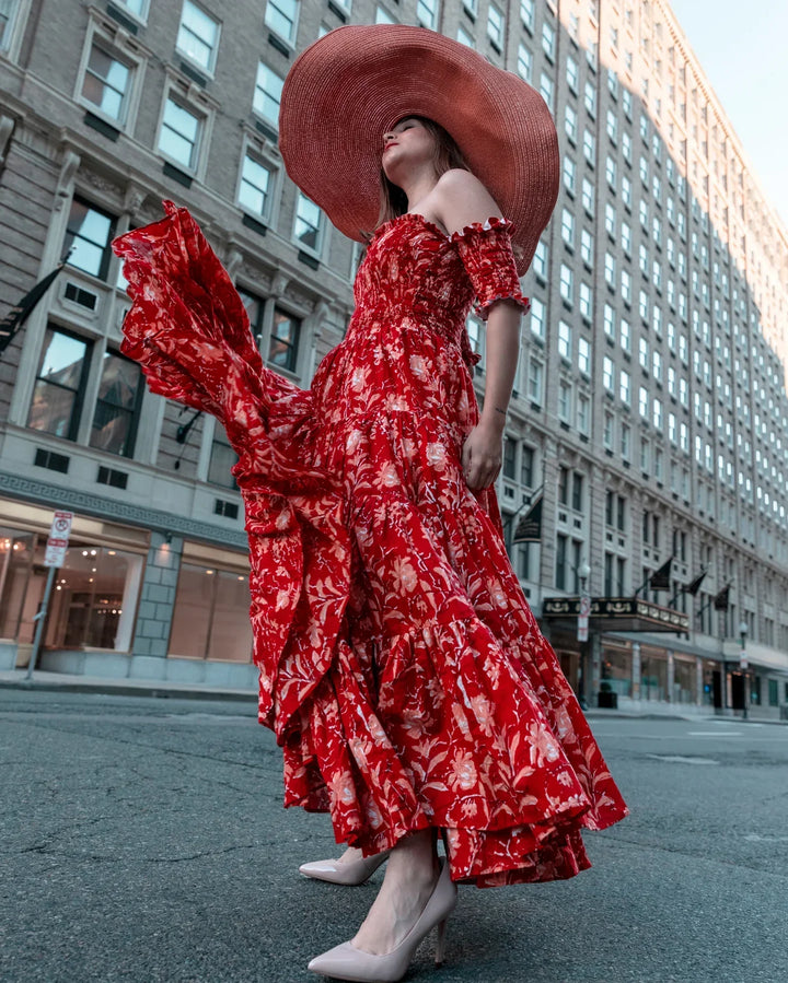 WOMEN FLORAL PRINTED LAYERED GEORGETTE FIT & FLARE MIDI DRESS