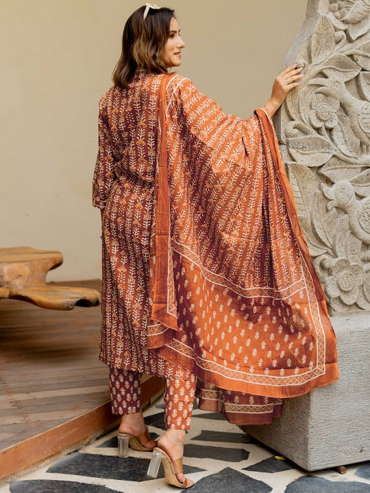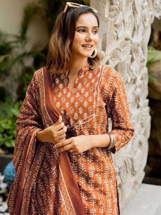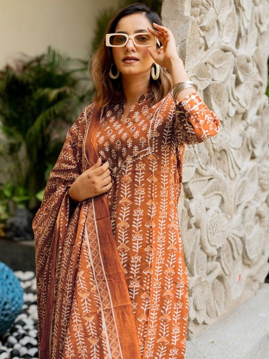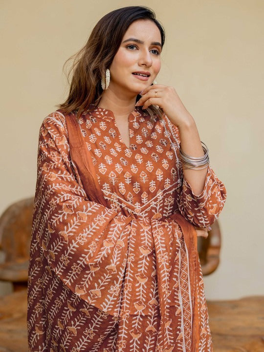 RUST & WHITE PRINTED KURTA WITH TROUSERS WITH DUPATTA