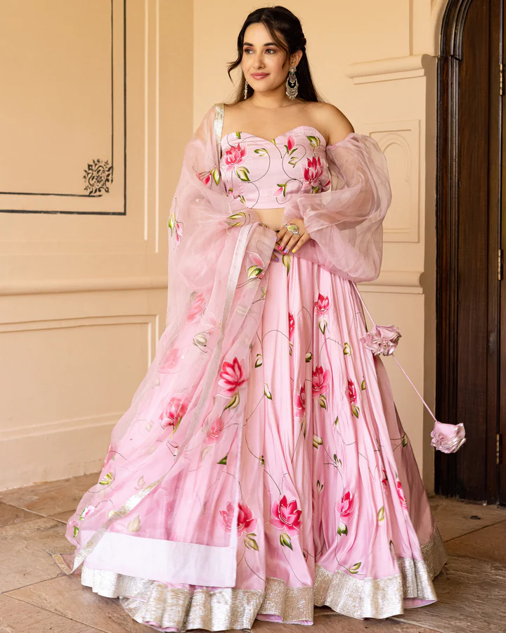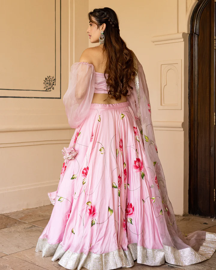 The Surati Handpainted Lehenga Set is a beautiful symphony of the baby pink colour with lotuses and jaal handpainted on the long flair of the lehenga. The blouse is made to perfection with puffed organza sleeves and a gorgeous neckline. This outfit is perfect for a day wedding or any occasion that required you to look graceful and charming.