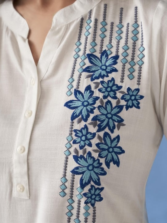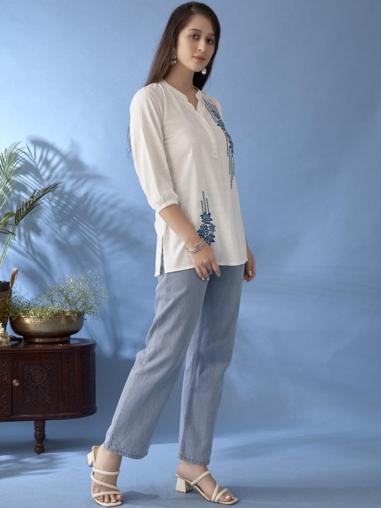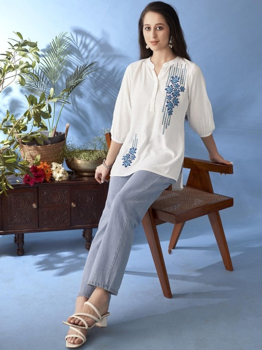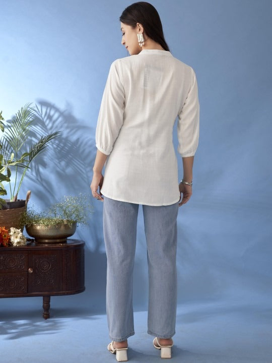 WHITE EMBROIDERED PUFF SLEEVES STRAIGHT SHORT KURTI