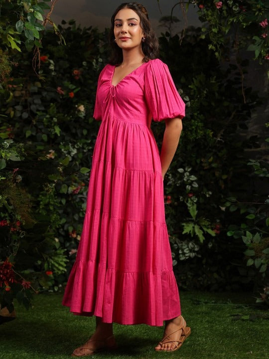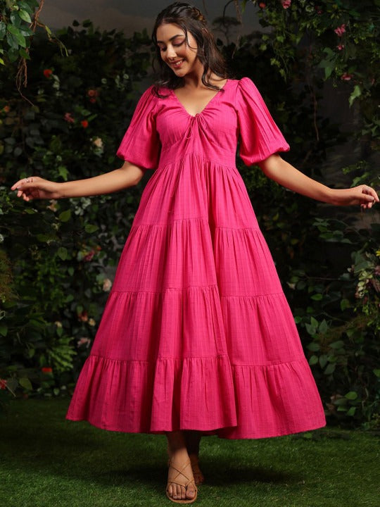 WOMEN CHECKED COTTON FIT & FLARE MAXI DRESSES