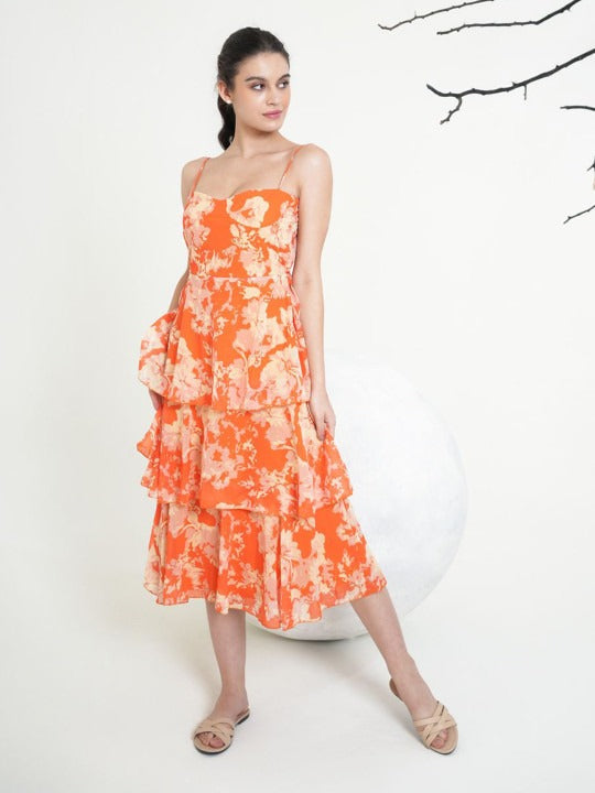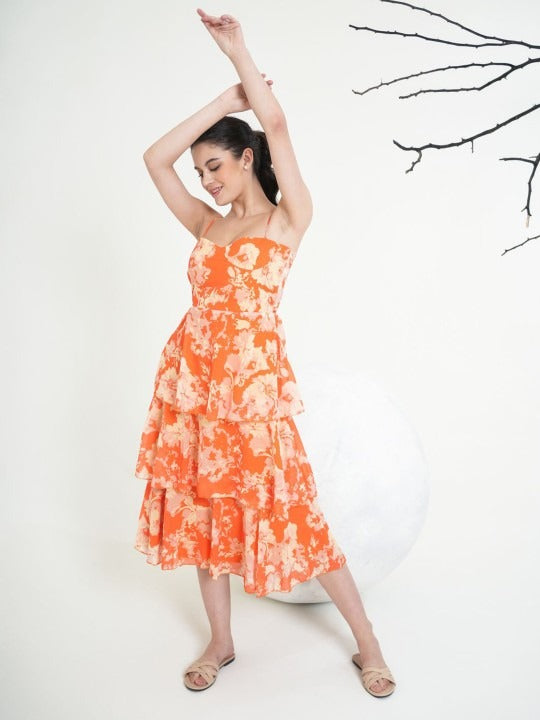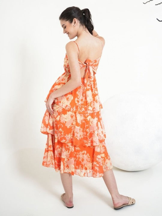 Orange floral print fit & flare dress, Shoulder Straps, Sleeveless, Shoulder Straps, Tie-up detail, Midi length in flared hem, Georgette fabric