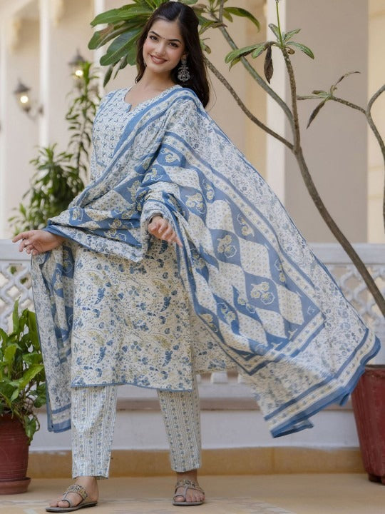 BLUE PRINTED COTTON KURTA WITH DUPATTA
