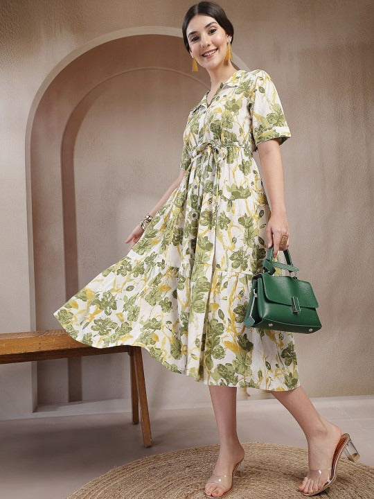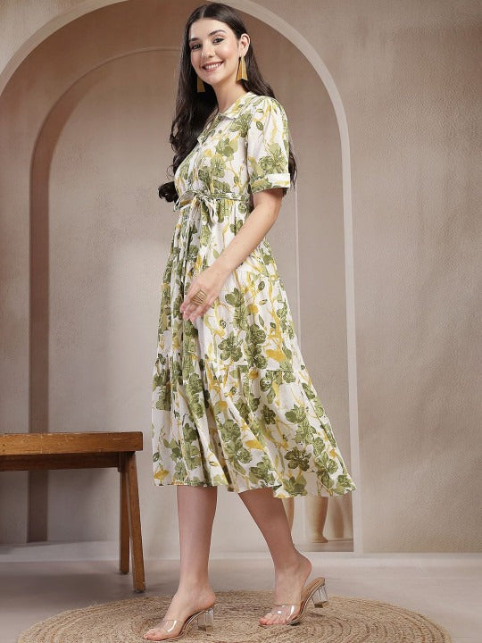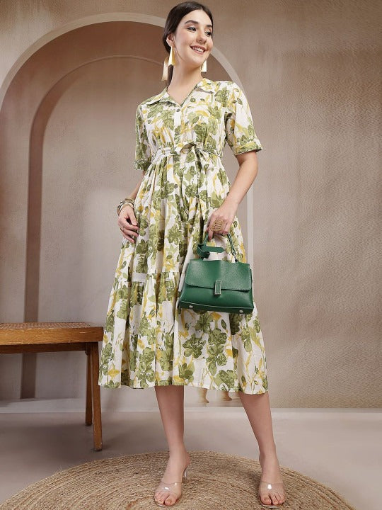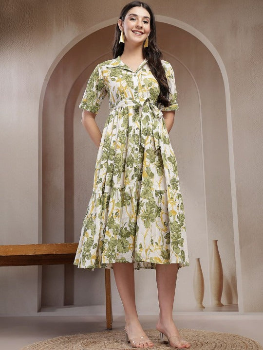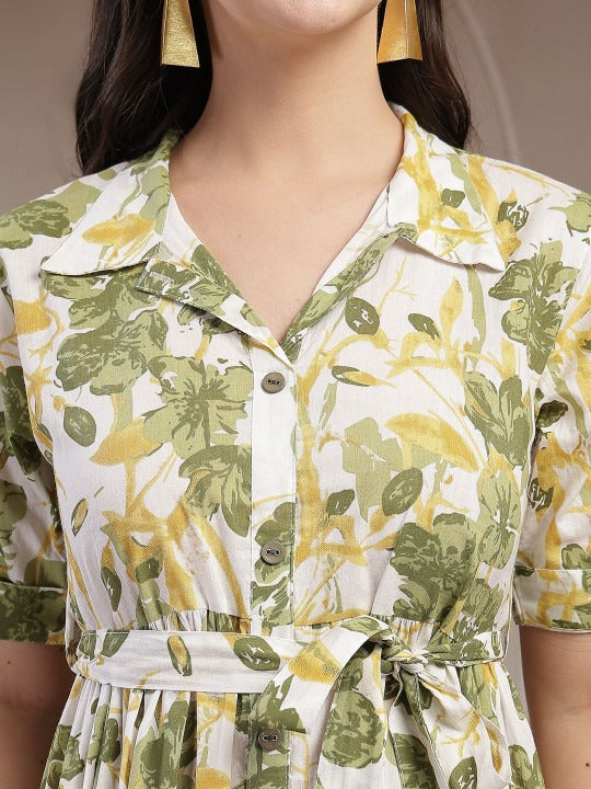 GREEN FLORAL PRINTED SHIRT MIDI DRESS