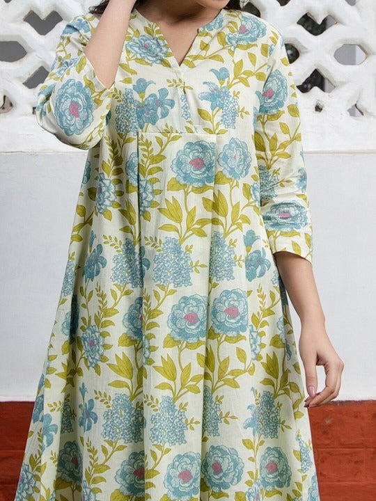 Colour: off white, blue and green, Floral printed, Mandarin collar. Three-quarter regular sleeves, A-line shape with regular style, Above knee length with flared hem