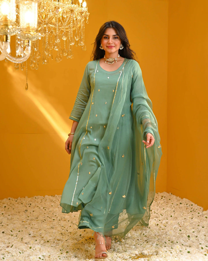 Step into elegance with the Yashvi Cotton Suit Set in serene sage green! This Anarkali-style A-line kurta flaunts a round neckline and diamond-shaped gota lace embellishments on the front. With three-quarter sleeves and a matching inner, it pairs perfectly with comfy pants and a stunning gota-flower adorned kota doriya dupatta. A fun, festive must-have for your wardrobe!