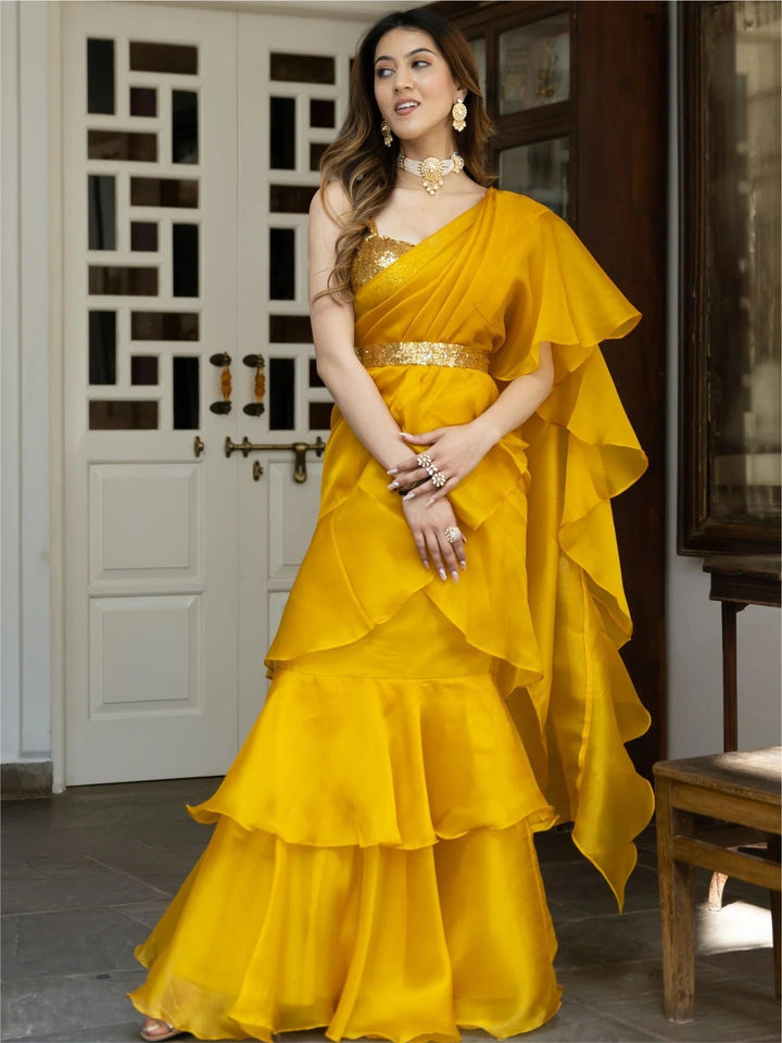 YELLOW SEQUIN ORGANZA RUFFLED SAREE